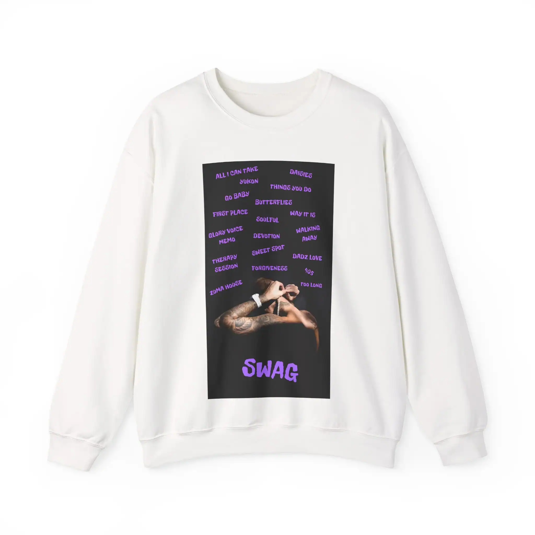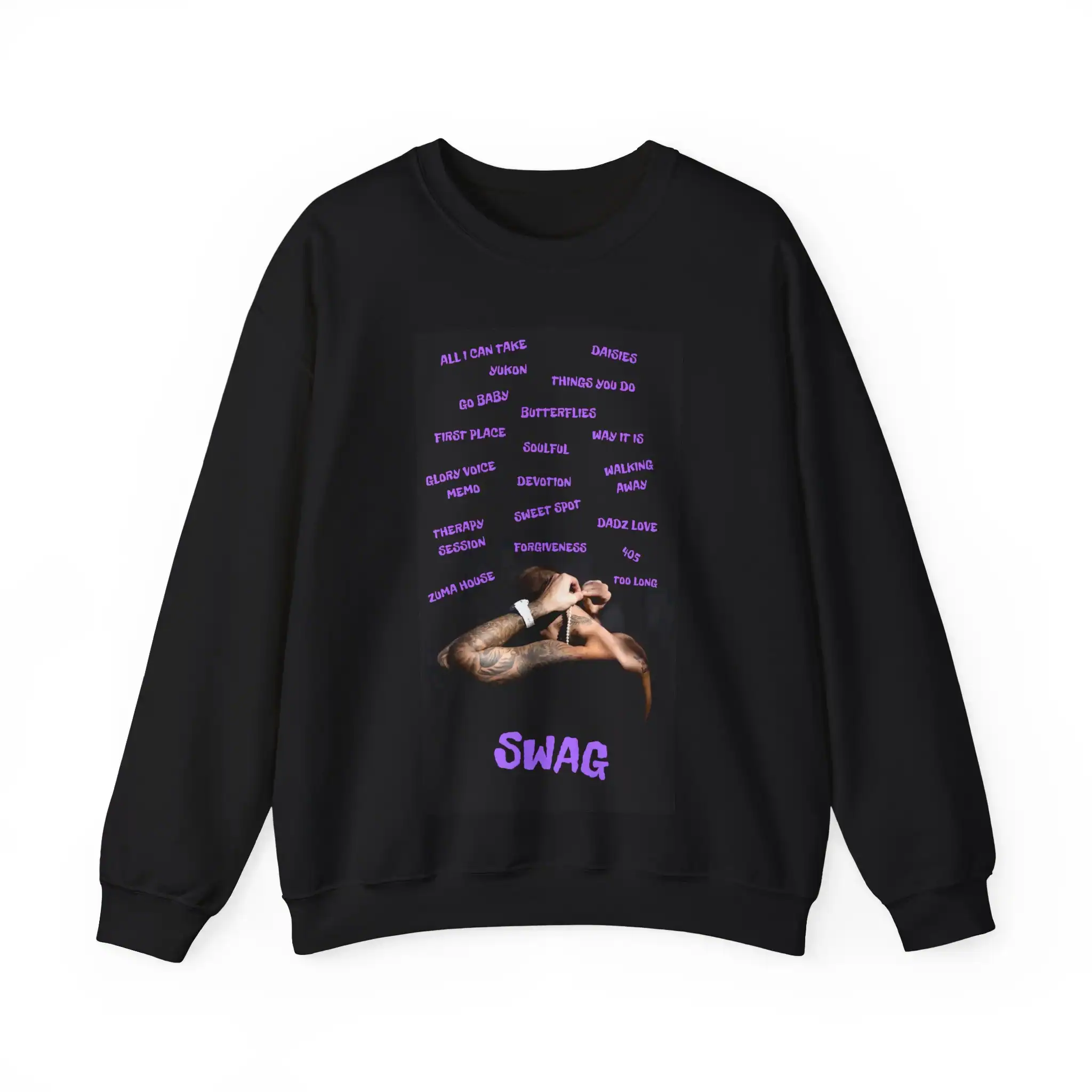 Vintage Justin Bieber swag merch sweatshirt with purple text, featuring song titles and a photo of Justin Bieber in a casual pose, perfect for fans and streetwear style lovers. Plain black Justin Bieber swag merch sweatshirt with minimal design. V-muted black Justin Bieber swag merch t-shirt with purple text design.