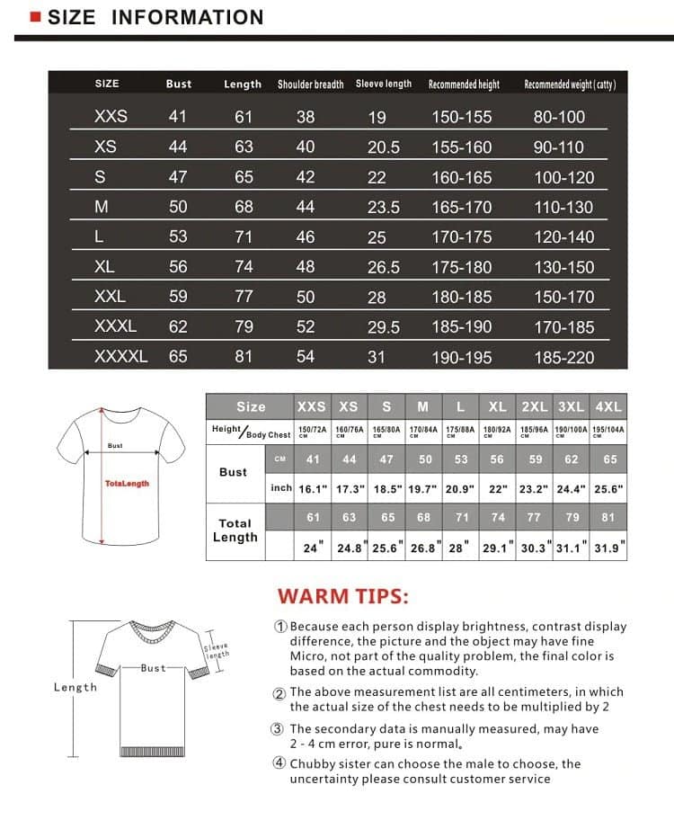 | Size | 2XS, XS, S, M, L, XL, 2XL, 3XL, 4XL |